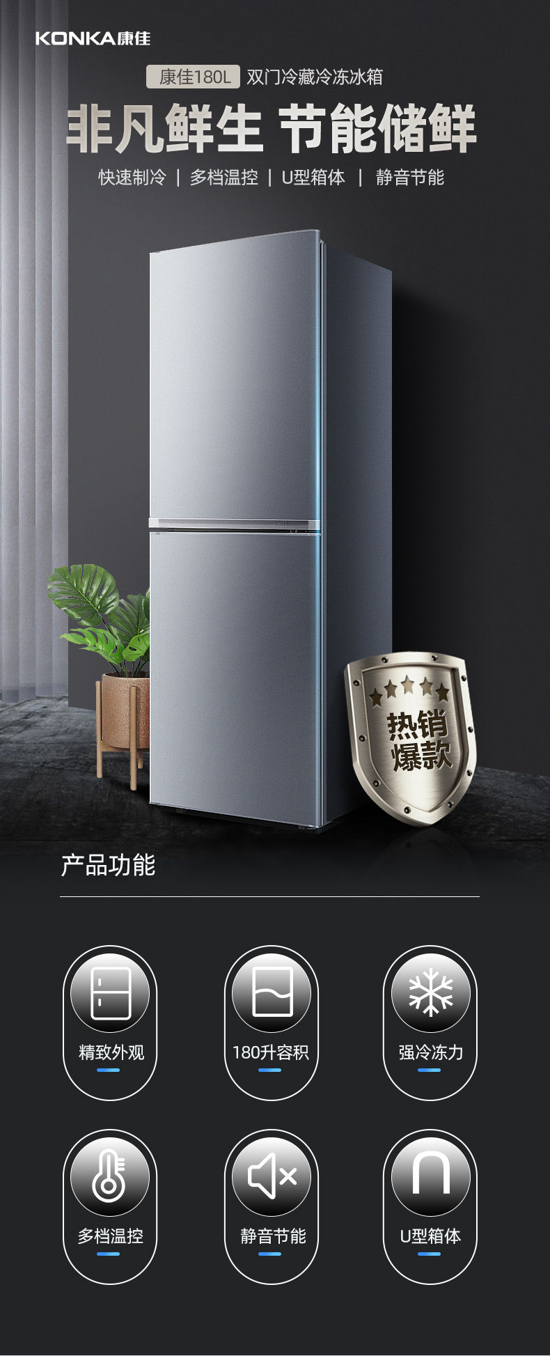 康佳BCD-180GY2S双开门冰箱家用节能出租房小冰箱
